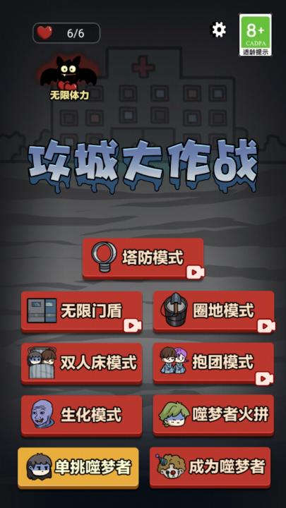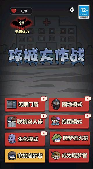 1、进入攻城大作战后,选择游戏模式。游戏拥有八个游戏模式:无限门盾、圈地模式、联机双人床、抱团模式、生化模式、噬梦者火拼、单挑噬梦者,成为噬梦者,小编这里为了做教程,就随便选择了无限门盾。