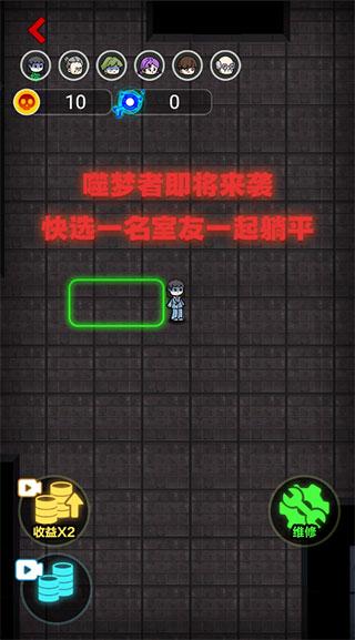 4、点击上床,进行躺平,然后点击维修,加固室内的安全防御,防止噬梦者破门而入。