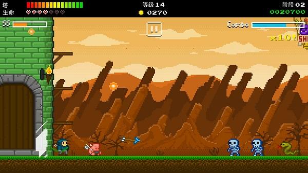 每个关卡都有独特的背景以及Boss,这对于一部像素游戏而言尤其难得唯一的不同,却是“根本”不同:“塔”是你的老家,除此之外没有任何的防御设施可供布设。左手上下滑动屏幕,控制英雄在4个(含地面)平台之间运动,右手连续触屏发射武器,以这种“上下逢源”的方式迎战空地一体进攻的敌人。你可以将其理解为丧尸从4条“车道”进发,而你的“豌豆射手”只有一个!