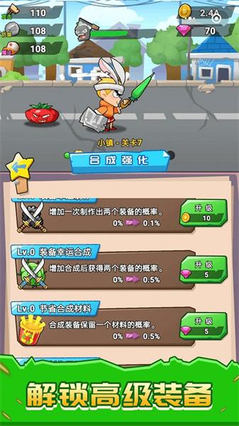 -玩家通过关卡可以获得钻石金币,钻石金币可以升级技能,如装备幸运合成和增加属性值;