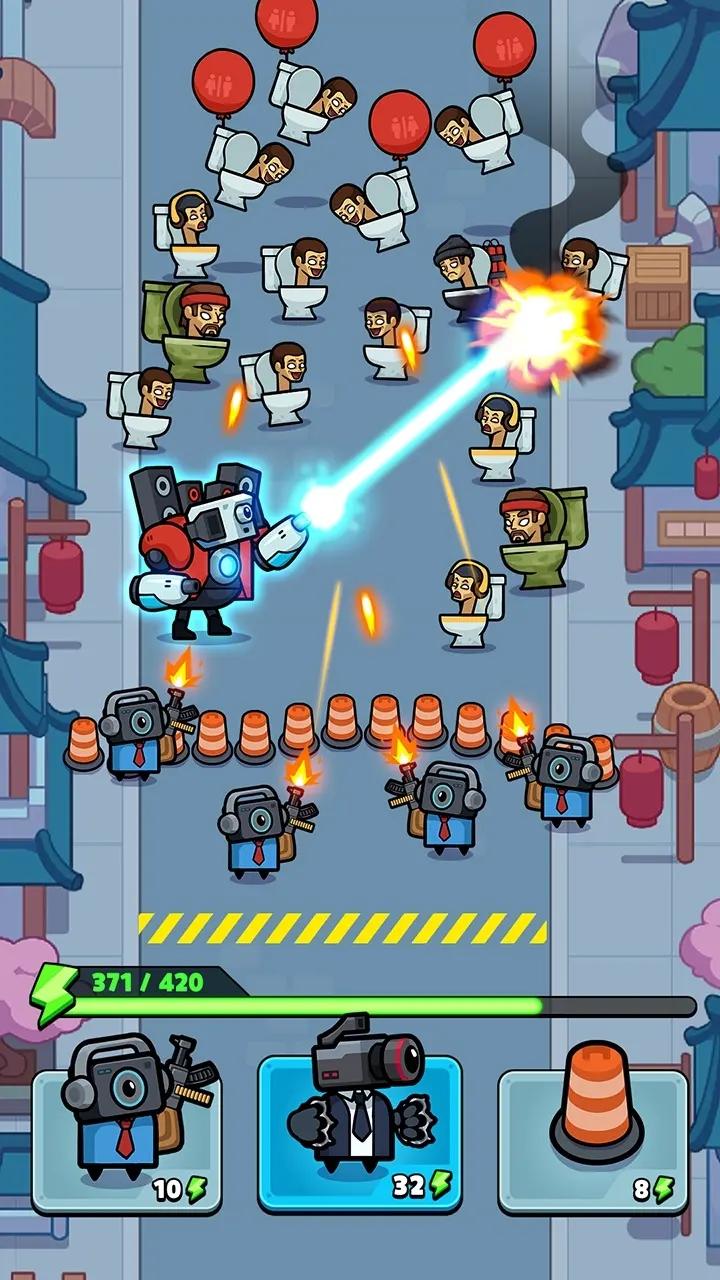 厕所大战马桶人vs监控人是一款非常奇怪的策略塔防射击游戏。在这里,玩家需要升级你最强大的武器,消灭各种厕所僵尸,并选择最强大的军官来保卫城市。恢复和平!