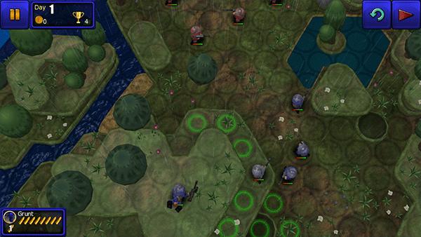 前三种难度下以突击队员的强悍攻击力和防御力,完成任务不难。Ridiculous级的敌军攻击力太高,满血特种兵也不能在一回合内承受1个步兵加1个狙击手的攻击,需要小心移动,停在敌兵的最大攻击范围外。中间还要到回复池补一次血。走上边的路用时7-8回合。