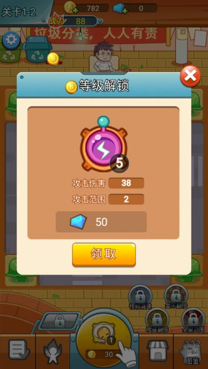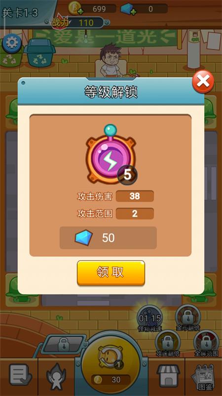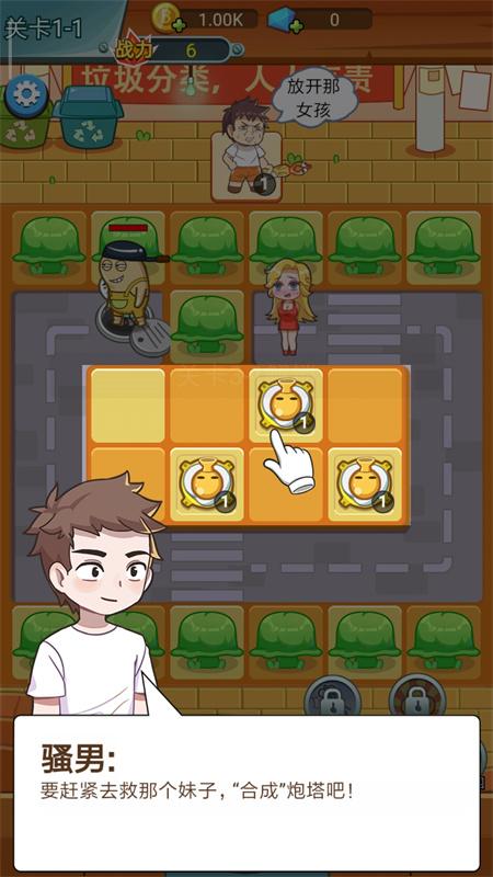 3、玩家需要保护那个女孩,利用空余位置放置道具来消灭人群,炮塔可以进行合成,合成之后会变更高级的炮塔;