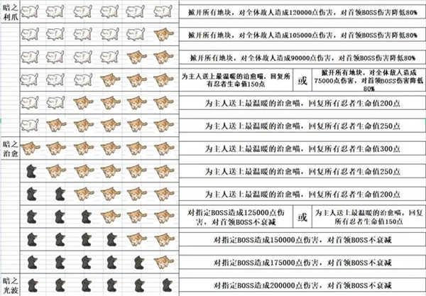 ③ 6只黄猫发动暗之治愈:为主人送上最温暖的治愈喵,回复所有忍者生命值300点(搭配任意猫依次递减)