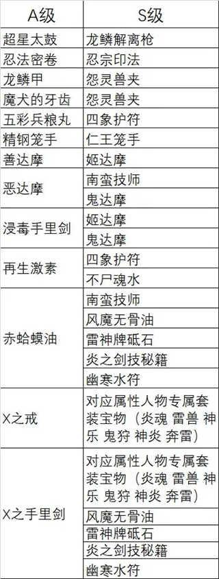 同时需要注意,A级魔犬的牙齿、五彩兵粮丸、善达摩、恶达摩、赤蛤蟆油、超星太鼓、银枭夜行服、龙鳞甲等不是合成同名S级宝物的特定宝物
