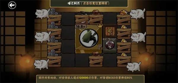 ① 6只白猫发动暗之利爪:掀开所有地块,对全体敌人造成120000点伤害,对首领BOSS伤害降低80%(搭配任意猫依次递减)