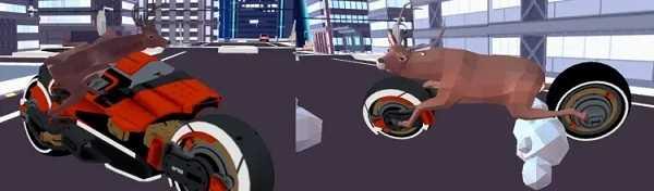 说到赛博风的未来世界,就不得不让人想到著名动画阿基拉,非常普通的鹿在这里也是致敬了其中经典的红色摩托,乘坐时更有特写镜头,做戏就要做全套啊。