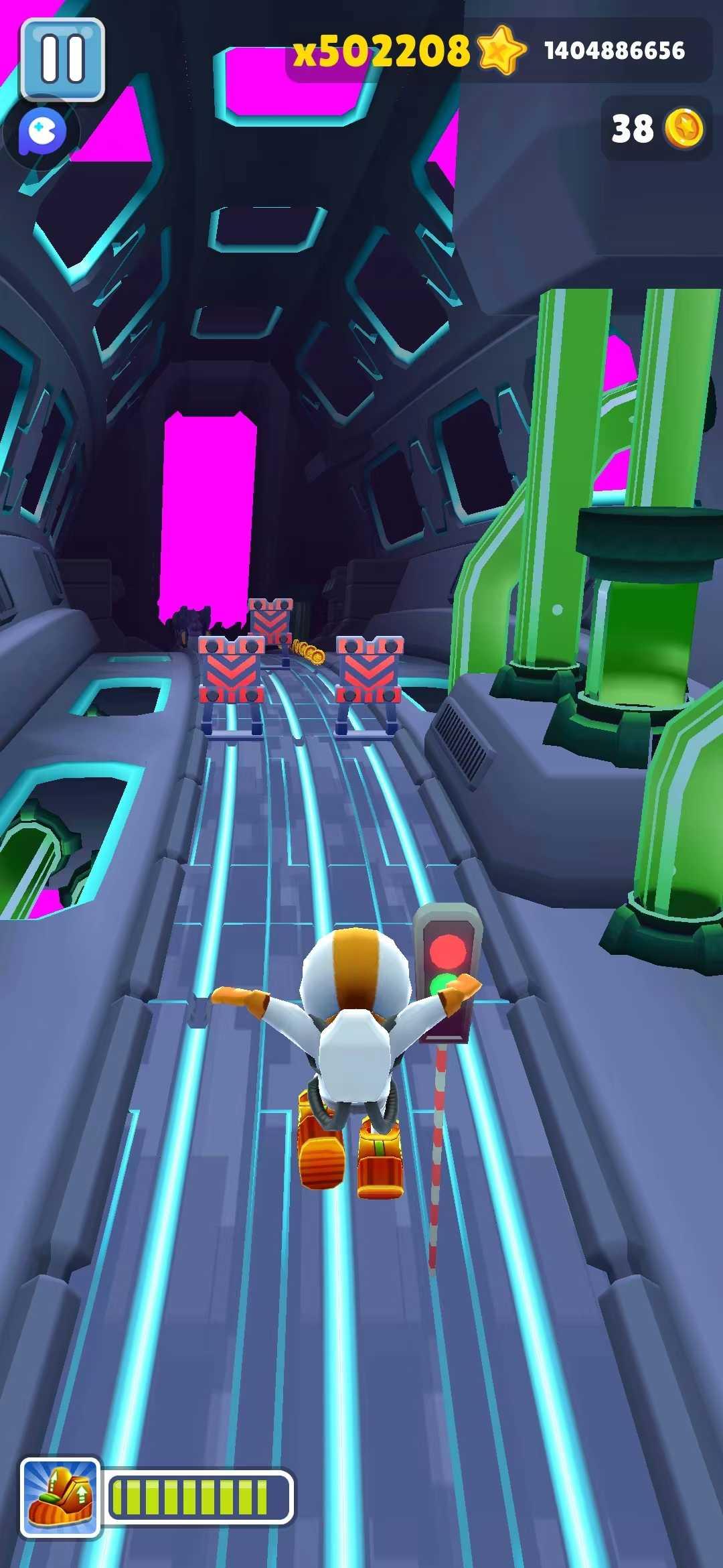②速度加分,速度越快,得分越多,提高速度有三种方法,喷射器,极速滑板,宝物(不推荐),喷射器在使用的途中也可以被极速滑板提速,两者相加,速度极快,得分很高。