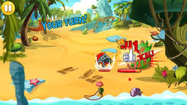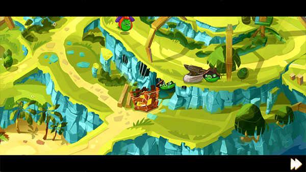 小鸟们乘坐鸟船来到了石灰石泻湖,这一关总共有三轮敌人。第一轮对面只有一个海盗,完全是给我们来练手的,两个攻击回合就可轻松解决它。第二轮对面敌人的数量开始增多,第一回合先用小鸟们的自身防御技能,接下来的回合先杀死全部小兵再解决戴头巾的BOSS。