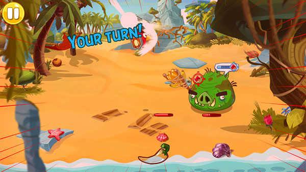 这一关敌人比较特殊,四个白色敌人每当被打死并不会消失,两个回合后会再次复活。这样我们就先攻击大绿猪,然后再来对付四个白色敌人,黑鸟使用辣椒大招,当它们血量都是0的时候我们就可获胜。