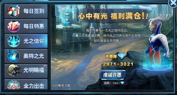 2、对于仅是月卡党如果你不着急花钻石,你可以存五天参加一次光之信仰!每五天你可以参加一次活动,这样每五天使自己钻石多增加50~100!