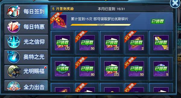 3、同时月卡党可以利用每日签到帮助参加光之信仰,有些签到日期对应不同钻石数,不同等级的vip可以根据自己等级完成光之信仰活动。
