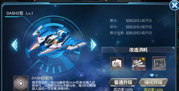 改造DASH1号时,有几率将战机改造成超能战机DASH2号,当DASH2号达到Lv3时,DASH2衍射光:每次攻击时,都有20%的几率将衍射光打入敌方体内,并对周围单位造成每两面一次的伤害,持续6秒。