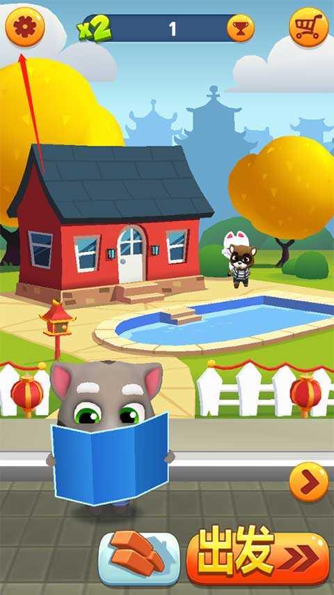 1、进入汤姆猫跑酷主画面后,看到汤姆的庭院,在这里要不断提晋从而一直建起,点击右角‘出发’的黄钮。