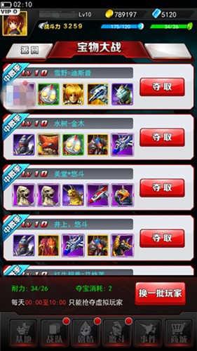 4、当玩家等级达到10级后,将会由剧情任务带领开启宝物争夺系统。在这里,玩家朋友们将会优先遇到一些弱小的NPC角色,供大家练手,但其部件掉率也相对较低。其次,则是能够刷新出距离玩家等级和战斗力相近的拥有玩家所需要部件的角色,小伙伴们能够通过巧取豪夺的方式,从对方手中抢夺自己所需的法宝和变身器部件,从而合成强大的成型物品,提升人物战斗力