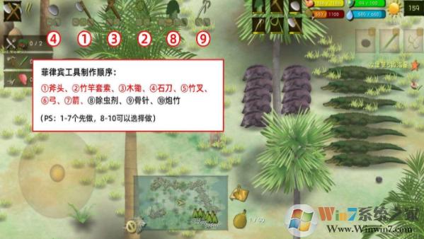 开局制作工具的先后顺序:①斧头、②竹竿套索、③木锄、④石刀、⑤竹叉、⑥弓、⑦箭、⑧除虫剂、⑨骨针、⑩炮竹