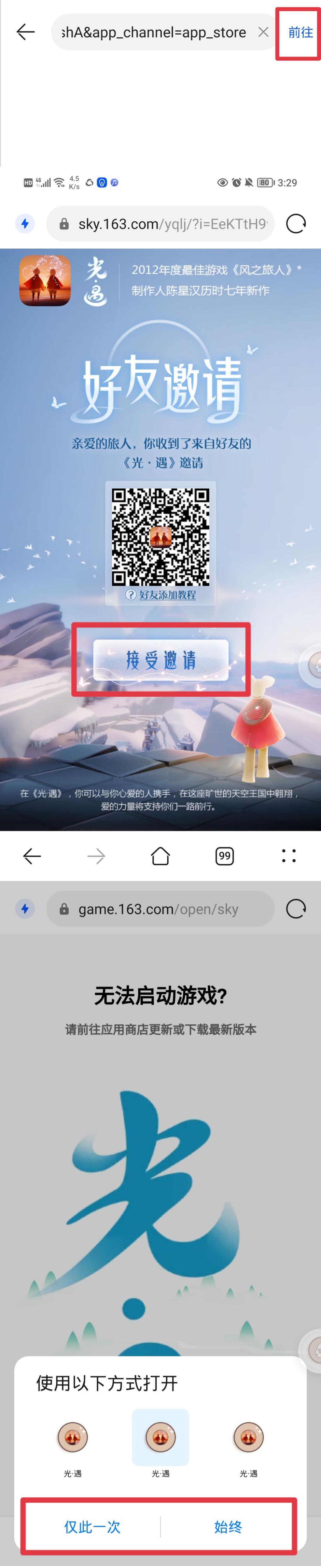 复制别人的链接,把链接放在浏览器打开,点击接受邀请,打开光遇即可。