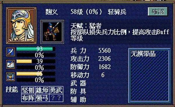 最早可以被我军购买的武将,统武比武松更平衡。最后一个没有显示的技能是“强骑”。速度优秀,也有“雄狮”、“勇武”和“坚韧”这些实用技能,但“治疗”有点鸡肋(作为敌人给我军磨炼有用),在人才济济的蜀汉骑兵阵容中排不到前茅,因此时评价B的替补。