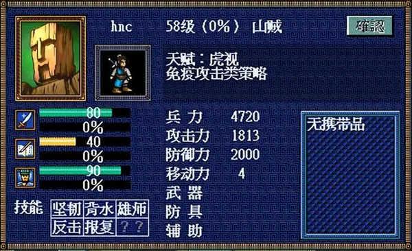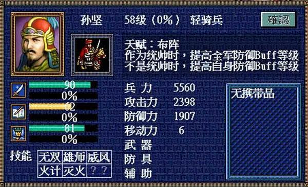 攻击算合格,防御比较出色。首先天赋“虎视”可免疫攻击类策略,这是直面敌人妖术师们的最佳人选,只有40较低的智力可以无视了。技能“雄狮”可提高生命;“坚韧”和“背水”可提高防御;“反击”和“报复”增加反击率,不过攻击力有限而效果一般;没显示的最后一个技能是“攻心”可以吸收敌人兵力到自己,这个非常提高续航。可以说只要等级能上去,他是我军坚实的肉盾,尤其是雒城之战等急需保护我军重要人物的关卡。