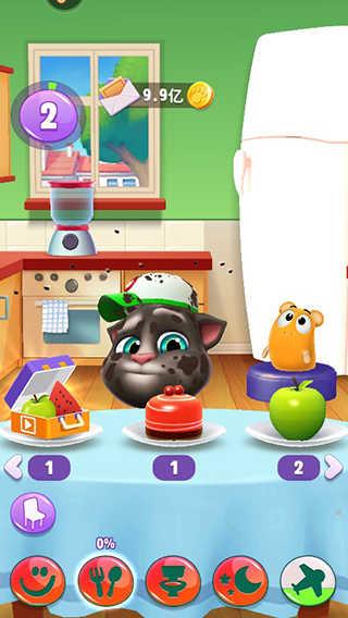 1、下方对应的四个四个区域对应汤姆猫的各种养成玩法,有开心程度,饥饿程度,精神程度,干净程度,需要如果数值变低,汤姆猫的心情也会变化。