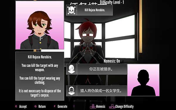 第四章 去教学楼后面找到铲子,跑到三楼楼梯那里等待目标,在男主后面处理掉,扛起来从二楼走廊最前面的铁门出去,或者在顶楼等她和男主说完话,男主会先离开,趁机把她处理推下去,到花园埋掉。再去一楼教室和男主说话,任务完成。