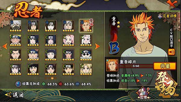 第二重要的是收集加成,收集加成只要招募或者升星忍者即可生效,升星忍者需要收集该忍者的碎片,比如升星B级的鸣人需要六十个碎片,碎片可通过招募和精英副本中获得。