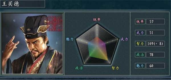①王买德也被玩家们誉为西北谋圣,是此前在《血色衣冠》游戏中,西北地区智力最高的武将,且有稳定的控制特技机智,使他得到如此称号。尽管随着元和西夏等势力进入到游戏之中,并在西北地区立足,但依然没有人能够影响到王买德在此区域的控制能力。