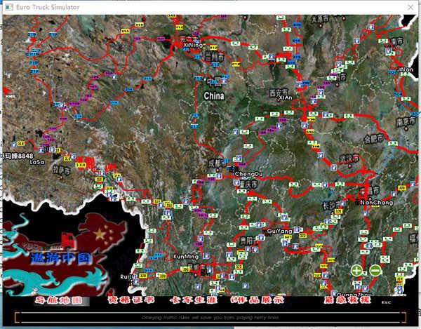 打开F5可以看到全局地图,按+ -号可以缩放和放大地图,按照上面的公路提示可以到达目的地。