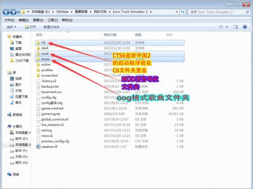 CTS6遨游中国2启动程序在Euro Truck Simulator 2C6binx86文件夹里面。汽车MOD语音导航MOD在MOD文件夹里面。music文件夹是OGG格式歌曲文件夹,