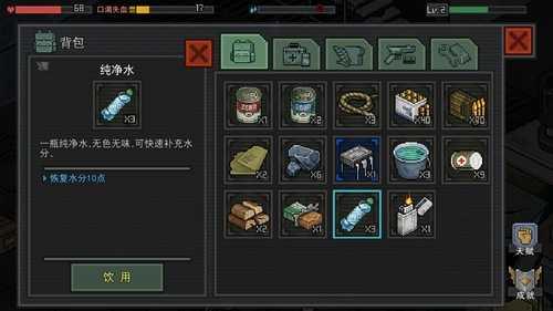 1、在像素危城里,饮用水是角色必须要携带的珍贵资源。虽说前期的时候角色对饮用水的需求量有限,但玩家能制作出干净的水来饮用。想要得到饮用水,玩家需要在第六关后用脏水做出合成水。