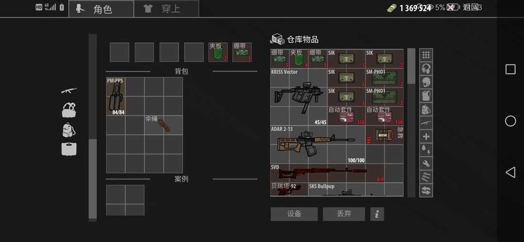 顶级背包的空间是用来放主武器的,主武器的选择一定要注意长度(有些长管武器,或者加装消音的武器是无法放进5格背包里的),以及武器是否有配件。不推荐放裸枪(没啥收益),6格的武器如果可以,就手持。