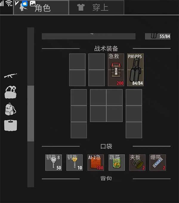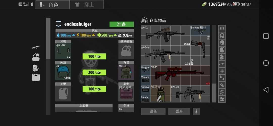 配置:头盔,顶配背包,一点药品,一罐蔬菜,一把满配pm手枪+额外一匣弹鼓。
