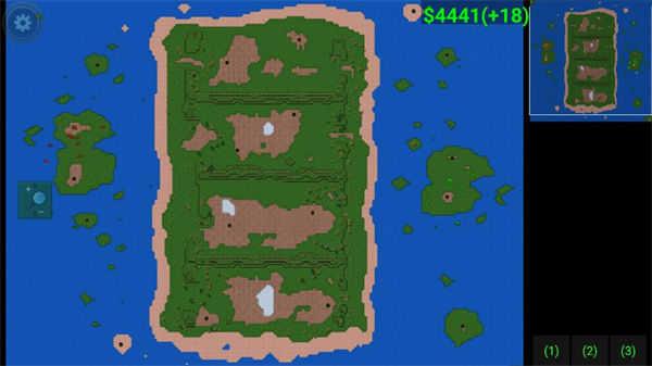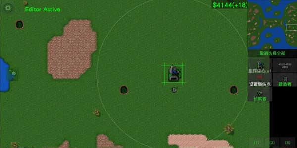 在游戏开始时,玩家会有一个指挥中心和一个建造者。指挥中心可以生产建造者和用于开图的侦查者,建造者则可以用来建造建筑。陆军工厂,海军基地,空军基地,机甲工厂这四种建筑物可以生产不同种类的单位。为了生产单位,你需要在资源池(就是地图上绿绿的池子)上建造资源采集器来获取资源。