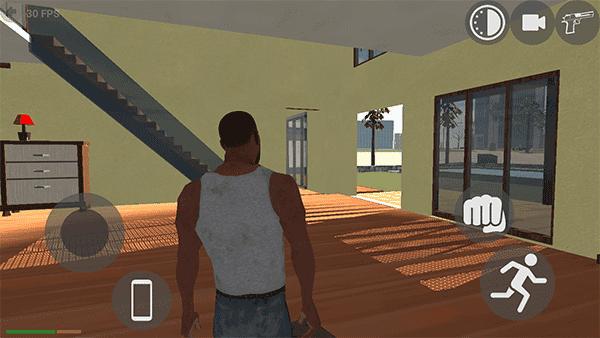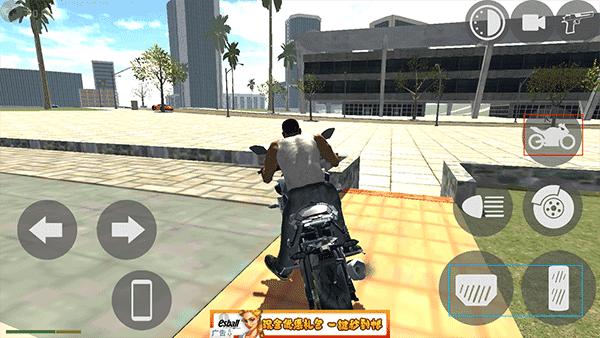 2、通过控制摇杆让人物走到房子外骑上摩托车,点击左右两侧的功能按钮控制车辆。
