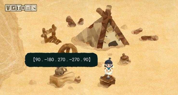 走出沙漠后卡朵会发现一处废墟一个锁住的箱子,箱子上有一串数字:“90,-180,270,-270,90”。这其实版块转动的度数。