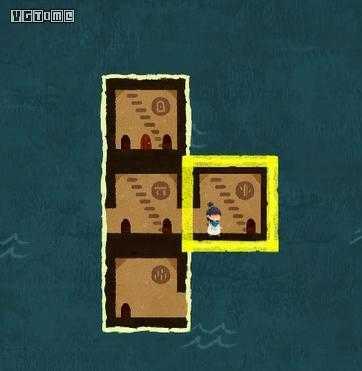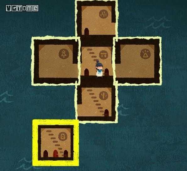 故事馆以红门所在版块为一层,卡朵按下图所示版块拼出,并来到地下一层右边的藏书间。再将这个版块挪动到地下二层,重新来到沙漠藏书间,找到草上飞。