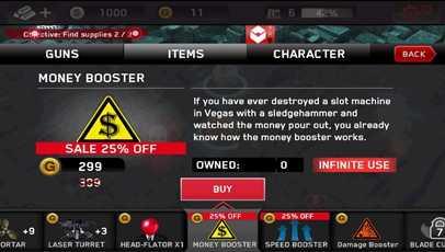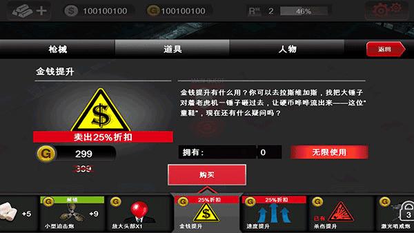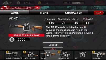 商店里出售主副武器,功能性物品,以及回血的绷带等。分为游戏币和金币两种购买方式。随着等级的提升,会解锁更高级的枪支以及装备物品。新手屌丝们只有一把枪,还是要快快升级速速赚钱买枪才是变身高富帅完虐僵尸的唯一途径啊!(咳咳,当然嘛,真正的高富帅还是直接使用金币购买哒~我等屌丝望尘莫及的说…)