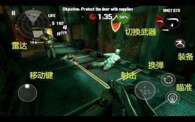 (图片上标注)左侧是移动按键,左侧上方是小地图雷达,显示僵尸距离。右侧上方显示弹量以及切换武器,这里说明一下,如果你的主武器弹量用尽,会自动切换到你的副武器上。右侧中间部分是角色携带的装备,比如绷带药箱等,玩家可以在装备界面自行装备。右侧下方分别是射击键、换弹键以及瞄准键。角色的视角转换需要在屏幕右侧空白处移动调整视角。