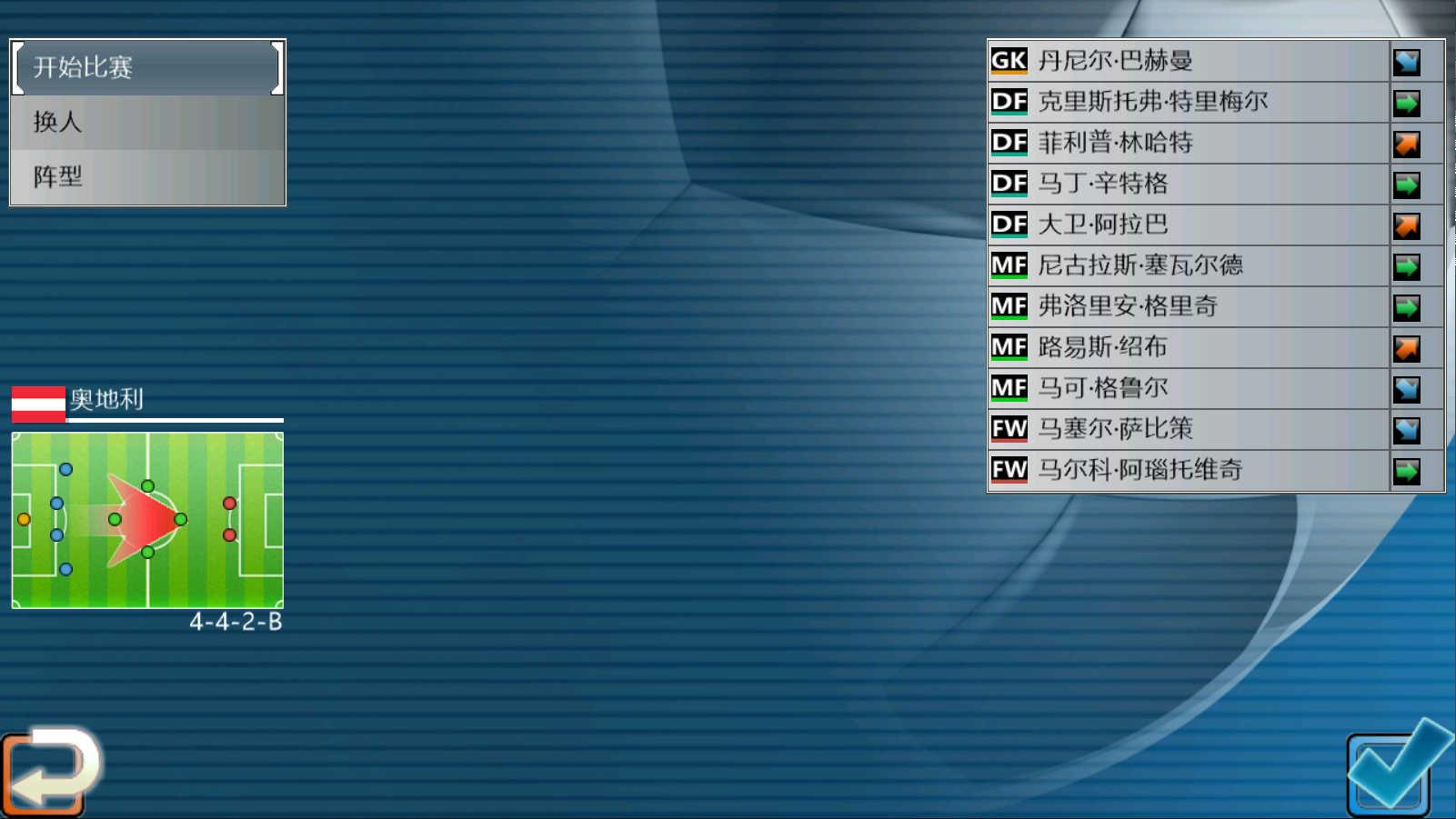 换人:针对首发阵容进行调整,每名球员都有能力盘和详细数据(GK为守门员 DF为后卫 MF为中场 FW为前锋)。按照闪烁方向键进行下拉和左右切换。