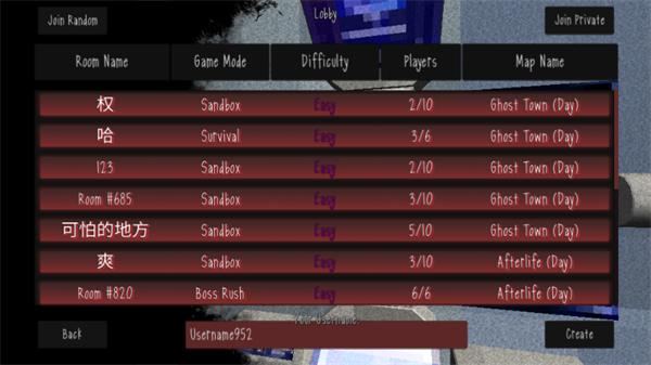 5.多人联机目前就一个服务器,晚上外国人多,从左到右功能依次是:房间名字、游戏模式、难度、玩家数量、地图名称。