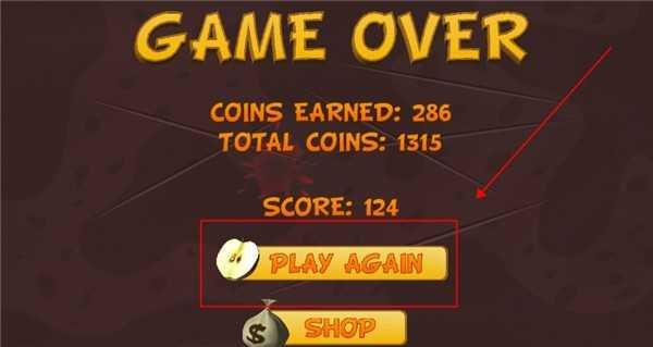 3、切完水果以后,游戏就会进入到结算界面,可以从中查看总得分以及金币的数量,金币可以用于在商店中购买刀刃皮肤