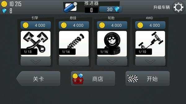 首先升级你的轮胎或提高发动机其次是前悬架和四轮驱动(不同车子能升级的项目有点差别),升级发动机到3级左右,然后慢慢的把其他几项也都提升到3级左右,之后有钱了再去升级发动机和轮胎,如此反复进行。车辆性能好了,也能帮助我们更轻松的过关。