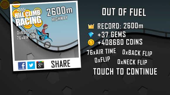 有趣的地方在于每次翻车后,会实时生成一张战绩截图,上面有游戏名称,有行进距离,有最佳成绩,还有羞耻的翻车姿势,如果你觉得成绩不错,或者翻车姿势很搞笑!