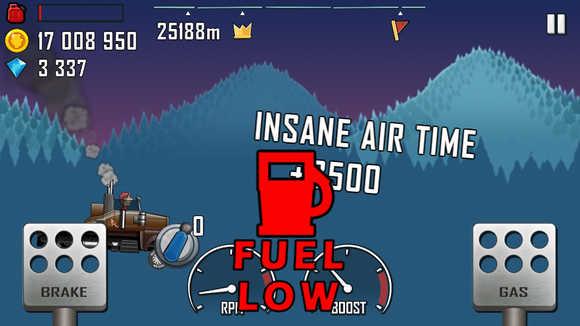初始车辆是一台破旧的红色小吉普,左下角是刹车,右下角是油门,中间有计算速度的刻度表。操作方式很容易理解,踩油门即可一路前进,一路上有很多金币、油箱可以补充,但这里要注意,不要贪图速度一味地加速,遇到下坡这样该减速的时候记得按左下角的刹车哦。