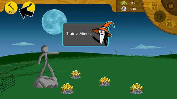 然后等敌人来了后控制矛兵,然后让矿工撤退,让城堡弓兵射,你就顶个盾吸引伤害不让敌人打雕像就行了