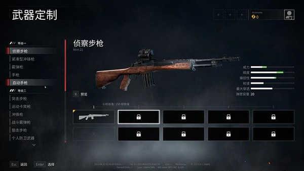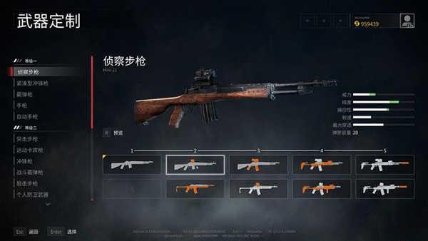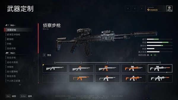 7、以侦察步枪为例,可以看到升级解锁后会增加很多模组,以橙色显示在枪械图标上。瞄准镜、消音/制退器、护木、握把、弹匣、枪托、机匣的改装都很丰富。