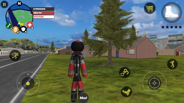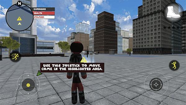 左侧移动、加速,右侧绳索,攻击(跳跃),跳跃,右上侧的武器更换以及血量、经验的显示都实时更新,一览无遗,凭借着大家自由的玩法,与其他帮派的人物进行交火,期间杀人能够获得经验,杀多了会产生星级,警察和其他附近角色会特殊照顾你对你展开火热的进攻,而如何存活,如何将其他人物击杀则是你所需要完成的任务。