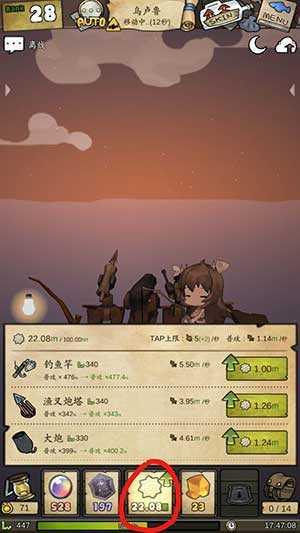 第五关开启“鱼叉炮台”自动攻击装备,这个和“自动钓鱼”“AUTO”是一套放置游戏的标配装置