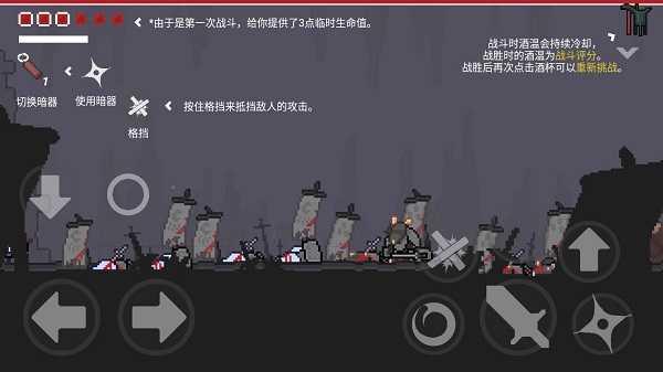 8、进入战斗界面,可以使用普通攻击和使用暗器来消灭敌人,也可以使用格挡来抵挡敌人的攻击,左上角为生命值,