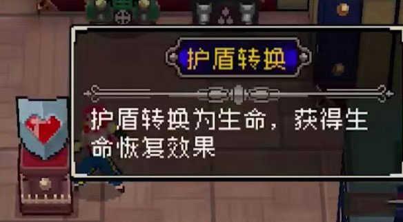 护盾转换为生命,获得生命恢复效果,生命转换的相反版本,个人认为没有生命转换好,虽然护盾可以回复而生命并不可以恢复,但是这个道具消除了爆盾效果,而且很多方法都可以恢复生命。